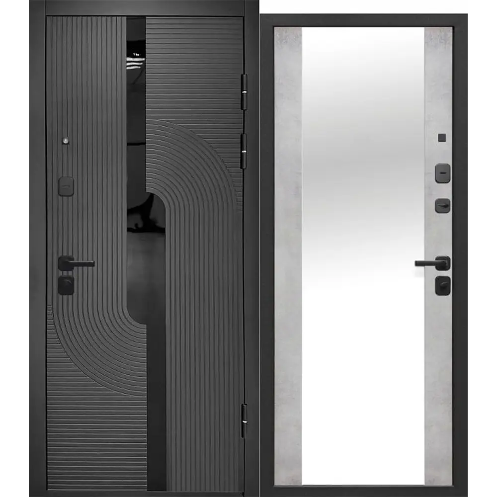 Входная дверь Е‑трейд 10 см «2 МДФ: Букле Графит / Зеркало Бетон Снежный»